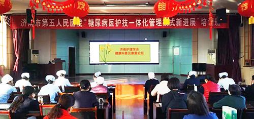 为进一步发挥护理学科优势,提升护理人员健康科普、康复护理水平,促进济南市护理科普工作、康复护理工作创新发展,持续改进护理服务质量,近日,济南市第五人民医院举办了省级继续医学教育项目“糖尿病医护技一体化管理模式新进展”培训班。本次会议按照疫情防控要求,采取线上线下相结合的方式进行,全市各医疗机构护理骨干200余人参加。