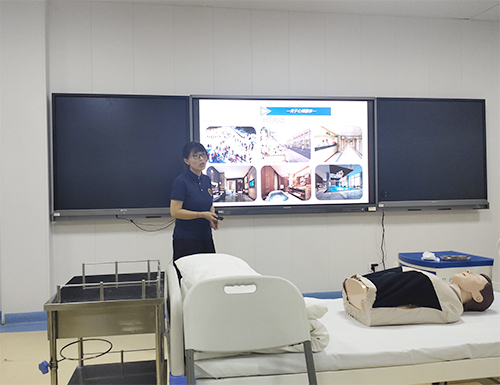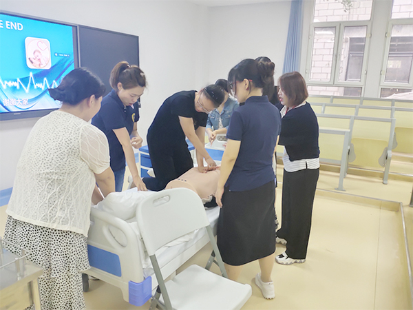本周在护理实训楼,健康学院全体教师组织进行了心肺复苏急救技能培训。本次实训由健康学院专业教师讲解并示范,大家认真学习并进行实操练习。 首先是王学屏老师对理论知识的讲解,讲解了心肺复苏步骤:评估环境,评估病人,呼救,摆体位,按压,清除口鼻分泌物,开放气道,人工呼吸等等。内容清晰易懂。