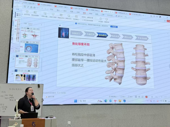 李秀艳讲授“骨与骨连结”内容,以临床问题为导向,从“腰椎间盘突出症”切入,引导学生掌握脊柱结构与连结。她运用动态图示与解剖模型,清晰展示病理过程,其讲解始终贯穿着医学人文精神的关怀。在介绍治疗手段时,她也会简要说明不同方案对患者生活质量的影响,体现了对患者整体身心健康的关注。这使得她的课堂,不仅传授了专业知识,更传递了医者的温度与责任。