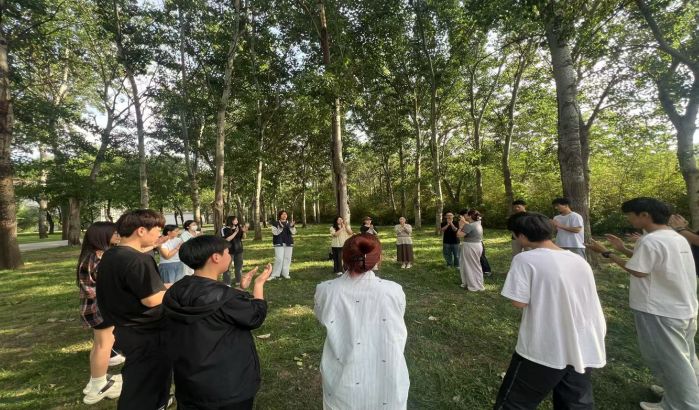 活动伊始,老师带领同学们围成一个大圆圈,开展“桃花朵朵开”热身游戏。随着欢快的音乐响起,同学们跟随指令迅速组队,如“桃花开3朵”即3人一组,“开5朵”则5人成团。游戏中,同学们积极互动,迅速拉近距离,现场气氛热烈。2024级学生佟瑞晓兴奋地说:“这个游戏不仅考验反应能力,更让我们学会了快速融入团队,找到自己的位置。”
