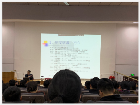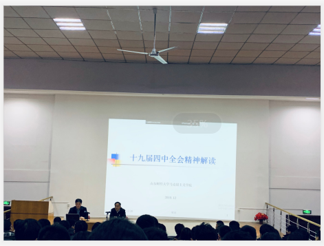 今天下午,我院党员教师及学院中高层领导,学管教师等于第一报告厅参加了深入贯彻党的十九届四中全会精神的学习讲座。
