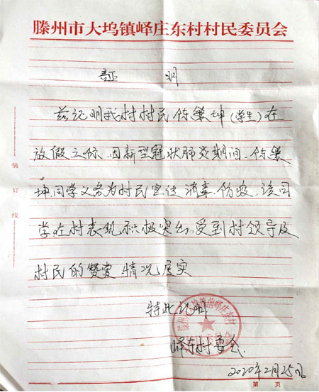 2020年伊始,全国各省份地区爆发了新型冠状病毒肺炎,尤其湖北省武汉市成了重灾区。作为一名在校大学生,时刻心系祖国、牵挂人民。在全国各地政府响应国家号召,从省到市到区、镇、村进行防疫一级戒备,随着村里建立病毒防疫点之际,受到赴汉医务人员的精神鼓舞,身为共青团员的陈繁坤同学积极投身到了抗疫一线,自发自觉为防疫做出自己的一点贡献。2020年1月份以来,在山东省枣庄市滕州大坞镇前峄庄东村的防疫点一线,协助防疫工作人员开展防疫工作。具体承担了人员往来登记工作。对于本村人员外出、外村人员入内进行实名登记、报送、测定、记录体温;对于进入本村人员,问清事由,事由不合格者不予以通行,或实施劝返等。同时协助村委会人员、上级监测人员深入本村家家户户,宣传防疫期间注意事项,调查外来返乡人员活动背景。另外,陈繁坤同学也承担着防疫点物资搬运等其他工作。