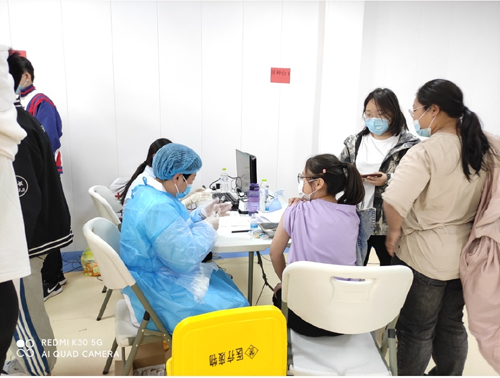 为更好地服务于接种工作,临时接种点设置了预检分诊台、登记台、接种台、观察室等场地,配备了10余名医务工作人员,并由多名志愿者进行接种指引,确保接种工作顺利进行。