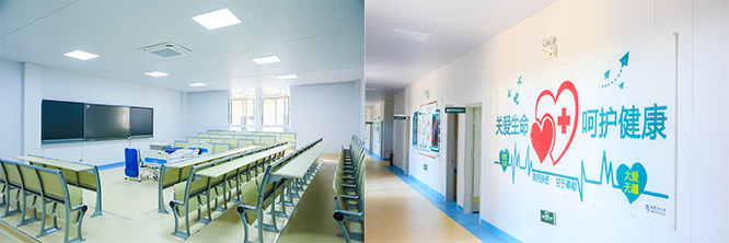 实习实训:2019年,护理实训楼落建完成,拥有24间实训室及千余套教学设备,按照小型医院标准进行教学配置,完全实现场景化护理教学与实训工作。山东圣翰国际医院为山东圣翰财贸职业学院附属医院,是一所三级甲等综合医院,院校一体,医教融合,实现了教学全过程及学生见习实习就业一体化一站式全覆盖,全面提高了人才培养质量。
