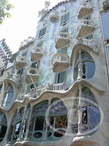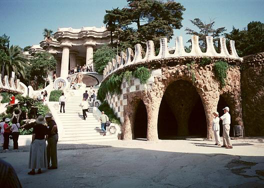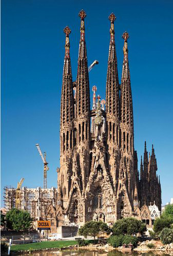 在高迪的眼中,一切灵感来源于自然和幻想:海浪的弧度、海螺的纹路、蜂巢的格致、神话人物的形状,都是他酷爱采用的表达思路,他痛恨硬邦邦的直线,乐于用柔和的曲线和五彩的颜色表达一切,甚至每一个烟囱的造型、每一块砖的摆法,他都有兴趣玩味半天。因此他承包的工程都成了鸿篇巨制,古埃尔公园整整耗费了14年,而圣家族直到他死后仍未竟,如果投资稳定(每年需耗资300万美元)的话,至少也得再建65年方可竣工。