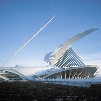 有的时候,他的设计难免会让人想起外星来客,极其突兀的技术美似乎全然出乎地球人的常规预料。这当然是得益于他在结构工程专业上的特长。早自20世纪初以来,桥梁的设计一直被托付给了路桥结构工程师,建筑师退避三舍好像已成习惯。由于有了卡拉特拉瓦,全世界的建筑师们才忽然发现了新的课题,在90年代前后爆发了对桥梁进行建筑设计的热潮,从一个新的角度重新开始塑造城市中的这类元素,进而影响到城市的面貌。2001年,卡拉特拉瓦在美国的第一个作品建成,是威斯康星州密尔沃基的美术博物馆扩建工程。此地原有一个旧馆,是在1957年由当地的建筑师事务所设计的,这一次卡拉特拉瓦加建的Quadracci展厅,名号不大,其实却造成了绝对喧宾夺主的局面。