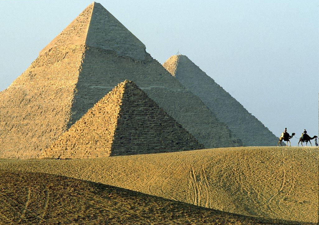 古埃及所有金字塔中最大的一座,是第四王朝法老胡夫的金字塔。这座大金字塔原高146.59米,经过几千年来的风吹雨打,顶端已经剥蚀了将近10米。在1888年巴黎建筑起埃菲尔铁塔以前,它一直是世界上最高的建筑物。这座金字塔的底面呈正方形,每边长230多米,绕金字塔一周,差不多要走一公里的路程。胡夫的金字塔,除了以其规模的巨大而令人惊叹以外,还以其高度的建筑技巧而得名。塔身的石块之间,没有任何水泥之类的粘着物,而是一块石头叠在另一块石头上面的。每块石头都磨得很平,至今已历时数千年,就算这样,人们也很难用一把锋利的刀刃插入石块之间的缝隙,所以能历数千年而不倒,这不能不说是建筑史上的奇迹。另外,在大金字塔身的北侧离地面13米高处有一个用4块巨石砌成的三角形出入口。这个三角形用得很巧妙,因为如果不用三角形而用四边形,那么,一百多米高的金字塔本身的巨大压力将会把这个出入口压塌。而用三角形,就使那巨大的压力均匀地分散开了。在四千多年前对力学原理有这样的理解和运用,能有这样的构造,确实是十分了不起的。