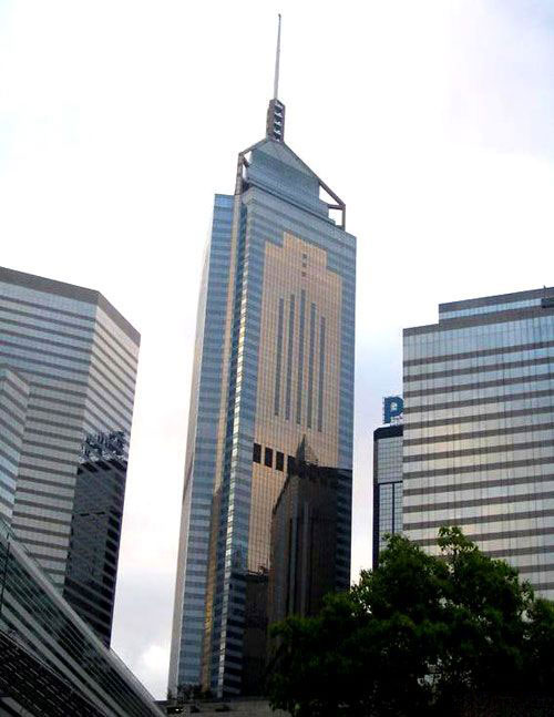 它是香港的摩天大楼,高度仅次于国际金融中心二期,楼高374米,地上78层。楼层平面呈三角形,但为免过分影响邻居的观景及风水,三个角被设计成稍钝,故平面实际上是个六角型。中环广场属于加固混凝土架构建筑。地面大堂分成两层,下层有高架行人天桥连接会议展览中心、入境事务大楼及地铁湾仔站。另一层有高速电梯前往47楼的空中楼阁(SkyLobby),即高层电梯大堂。前往空中楼阁以上的各层需要在空中楼阁转乘电梯。楼顶上的旗杆顶部装有风速计,标高为378米。 香港中环广场于1992年建成时是亚洲最高的建筑,直到1996年深圳地王大厦落成为止。 中环广场于1992年建成时是亚洲最高的建筑,直到1996年时深圳的地王大厦落成为止。中环广场的发展商为信和置业及新鸿基地产合组的财团。 设计结构 场中环广场属于加固混凝土架构建筑。地面大堂分成两层,下层有高架行人天桥连接会议展览中心、入境事务大楼及港铁湾仔站。另一层有高速电梯前往46楼空中大堂(SkyLobby),即高层电梯大堂,用户可在此转乘电梯往更高楼层。 中环广场大楼顶部的避雷针装有风速计,标高为378米。避雷针设有以四格显示的幻彩时钟—“丽光时计” 中环广场(LIGHTIME),但市民普遍不习惯其显示方式。 大厦由三部先组成:塔楼立于一个100英尺高,构成主人口及公共流通空间的基座上;塔有57个办公楼层,并在46层处设有一空中大堂;塔顶部分包括第75层以下的6个机械设备层,其上则为立足于3个切角处的三足桅杆。大厦看起来是三角形造型,其实并不是真三角形因为它的尖角均被切去。原因有二:首先是为了能有更多便于使用的室内面积;而更重要的是避免以其税利尖角冲向邻居而得罪他们。这样做不仅是不礼貌的更重要的是有碍"风水"。 大厦顶部以金字塔形状的坡顶以及立于其上的桅杆作收束,晚间日光照耀下闪闪发光。立面以三种不同颜色的隔热玻璃围护。金色、银色涂层的玻璃构成垂直和水平图案而形别涂饰的花玻璃穿插其间,形成典雅而又闪烁发光的形象。 底层地面上有一个优美宽阔的花园,与其比邻的公众休息场所一起构成一个供公众游憩的公园和在此十分忙碌的商业区中的一条步行通衢。