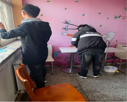 我们共同分成两队开始打扫卫生,楼上楼下,同学们拿起了毛巾报纸擦亮玻璃,一部分同学拿起卫生工具去楼上打扫老人的房间并且与老人亲切交流。