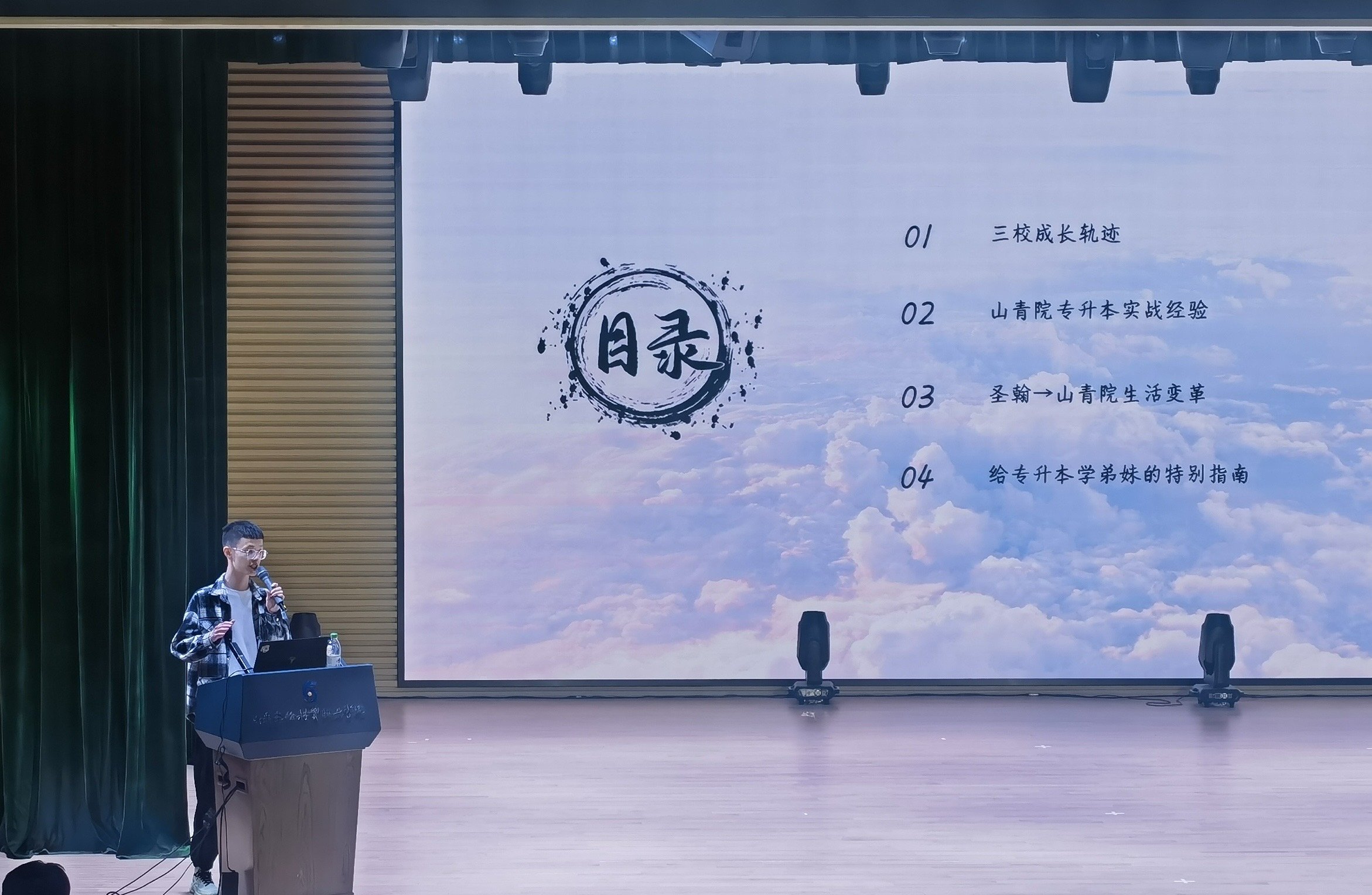 分享会上,邢桓维围绕自身经历,从四个维度展开分享。在“我的三校成长轨迹:从专科到硕士的跨越”中,他深情回顾在母校山东圣翰财贸职业学院的求学时光,感恩母校培养了他“脚踏实地”的品质,更将校内专升本视为人生关键转折点。他坦言,正是通过参与校内专升本培训,获得了系统的学习指导与专业的备考规划,从而明确了提升学历的目标与方向。进入山东青年政治学院后,面对难度大幅提升的课程,他积极调整学习策略,构建起系统的专业知识体系。即将踏入西京学院攻读硕士,他满怀期待,坚信向上攀登的过程,本身就是意义。