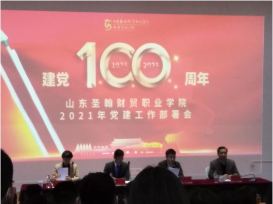 山东圣翰财贸职业学院于4月14日中午1:00召开党建工作部署暨党史学习教育动员大会,与会人员有校长刘广耀、副校长姜峤、党委委员汪娟海、各党支部书记、全体师生党员、学校副处级以上人员以2021年党员发展对象,会议由姜峤副校长主持。