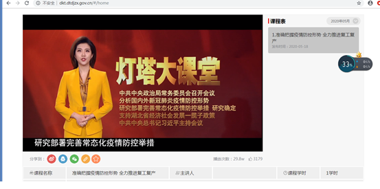 观看《灯塔大课堂》让我们知道了什么叫一方有难,八方支援。84岁高龄的钟南山院士继2003年抗击非典后再次出征,深入疫情前线。无数党员干部冲锋在防控疫情斗争的第一线。无数医务人员不畏生死、不计报酬抗击疫情。“众志成城,抗击疫情”成为2020年新春的集结号。我们要坚定信心,相信科学,不信谣,不传谣,坚决执行党委政府的各项措施。作为教师党员,应该主动积极的配合学校做好防疫防控工作,时刻关注教授班级学生的假期动态,做好疫情防控宣传。
