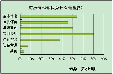 调查数据显示,44%的人认为需要介绍专业培养的目标和就业方向,还有25%的人认为需要用自己的语言介绍对本专业的理解,只有27%的应届生认为教育背景中应该主要介绍所学专业的主要课程。