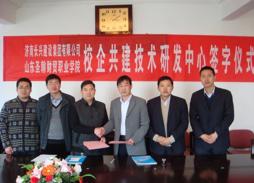 经过建筑工程学院牵线搭桥,2013年4月22日我校成功的与济南长兴建设集团有限公司签署了校企共建技术研发中心协议。山东圣翰财贸职业学院校长戈进杰教授、济南长兴建设集团有限公司董事长刘继忠先生、公司项目经理徐宁先生、建筑工程学院院长郑伟、副院长伊爱焦、就业科长房卓等出席了签约仪式。
