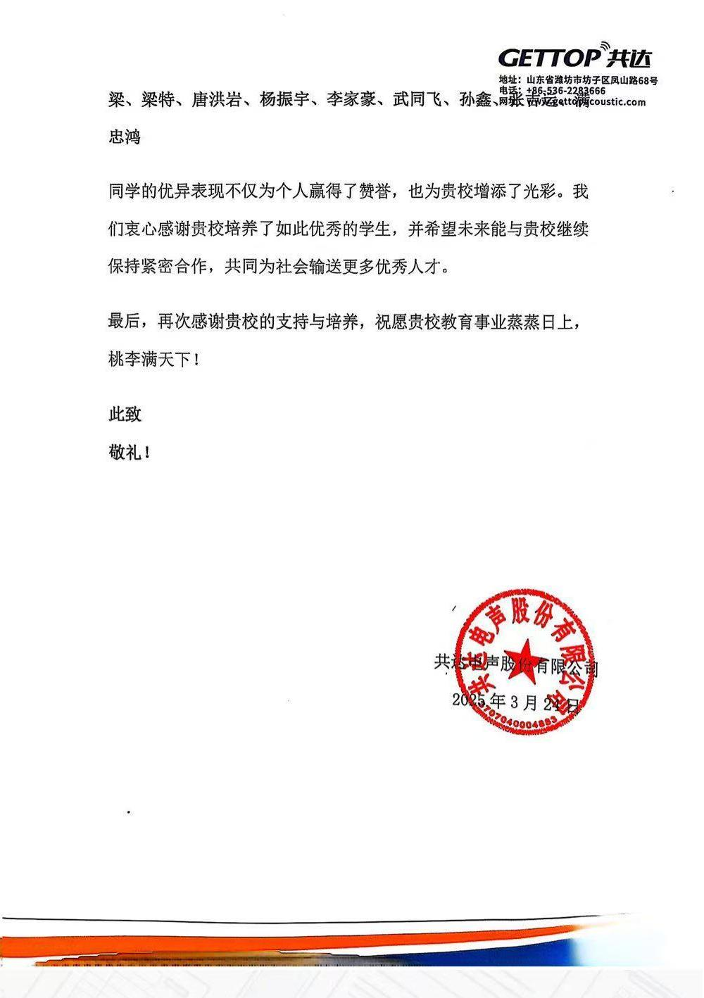 近日,共达电声有限公司向山东圣翰财贸职业学院发来表扬信,赞扬学院机电专业13名学生在实习中的优异表现,并向学院培养和输送人才表示感谢。
