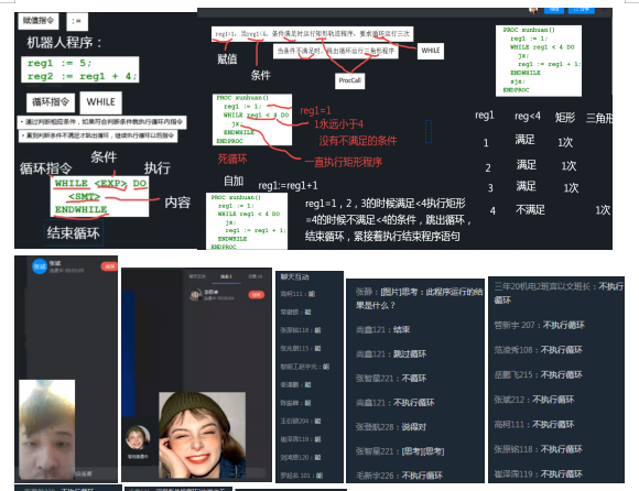同心防疫,共学共进,2020年4月19日,学校网课继续进行,下午,20级机电12班的工业机器人课,离上课还有两分钟,全班同学除了志愿者和请假的以及去做核酸检测的同学外均已进入直播课堂,有手机故障的或者没有流量的同学也及时进行了报备并申请了和其他同学用一部手机,在带问题看工业机器人实际操作的视频连麦同学的环节,同学们均能及时接收并积极回答问题,在编程指令学习环节,李臣卓同学能清晰地说出操作步骤,老师按此步骤操作,机器人能正确执行程序,这说明同学们听课认真,能深入思考,在不能实际操作的情况下依然能学会技能,在赋值循环和程序调用指令应用编程环节,张智星,尚鑫和岳鹏飞等十几位同学争先恐后地进行发言,抢答,对老师提出的拓展问题积极应对,沉着分析,思路清晰,圆满完成工作任务。