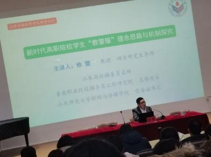 1月4日下午14:00山东圣翰财贸职业学院邀请到山东师范大学新闻与传媒学院党委副书记修蕾教授在第一报告厅做题为《新时代高职院校学生“教管服”理念思路与机制模式探究》的报告,学校组织全体教师倾听了修蕾书记讲座。