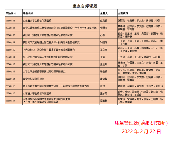 近日,山东省青少年教育科学研究院公布2022年度山东省青少年和青少年工作研究重大课题立项名单,智能工学院多位老师的课题被批准立项,其中孙会老师申报的《大学生职业规划教育研究》获批重点资助项目,资助经费2000元。