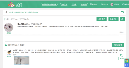 2)《汽车电气设备原理》是一门理实一体化的课程,所以周老师会在课下寻找适合学生并有真情实境的操作演练的实操视频,在上课期间合适的契机下放给学生进行观看学习,同时也会做好师生互动,针对实训项目操作中的难点和重点进行讲解,并及时提问学生,进一步提高学生对知识的理解和掌握。在一个实训视频学习完后,周老师会开启讨论和随机提问,进一步来掌握学生的学习动态和学情,对后面的教学进行调整和准备。