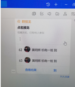 正式上课前,一般提前十五分钟在钉钉群里发布接龙的信息,让同学们接龙进行点名,同时提醒同学们准备好教材、笔记和笔,在课堂上养成做笔记的好习惯。让班长把请假或者有特殊情况的学生报送给我,做好考勤工作。下图是同学们的接龙情况。
