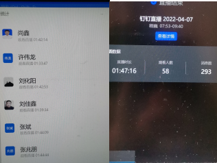 另外,每次课程结束后,系统都会有每位同学听课的时长,我会导出来,把没有听课的同学名单发送给导员,与导员及时沟通,共同进行管理。导员们都非常给力,会及时询问情况,并给我一个回复。下图是各位同学们的观看时长数据以及总体的观看人数的数据。