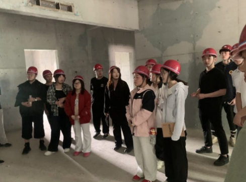 活动前,任课教师张熙凤强调了安全注意事项,为学生们分发并指导佩戴安全帽等防护装备,确保每位学生的人身安全。随后带领学生们来到学校宿舍楼施工现场。