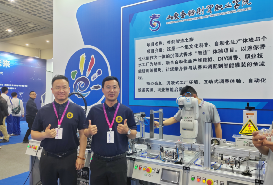 走进智能工学院展区,一座微缩版“智能香水工厂”跃然眼前。在自动化生产线模拟区,机械臂精准抓取玻璃瓶罐装香水,传送带将成品送至包装台,参观者可通过触控屏调整生产参数,体验工业4.0的智能化操控。我们以香水制造为载体,将传统调香工艺与智能制造技术结合,让职教课堂‘活’起来。