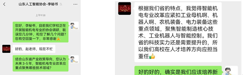本次线上访谈调研对象涵盖山东省人工智能协会、山东省智能制造协会、山东省装配制造业协会等多家省内重点行业协会,智能工学院教师与协会相关负责人就智能机电专业发展与人才培养展开深度对话。访谈中,学院教师结合专业建设实际,就未来3-5年智能机电专业改革的重点技术领域、课程体系搭建、技能培养重点等核心问题向协会负责人请教。