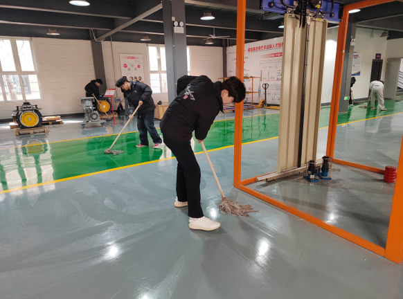 随后,同学们按分工迅速投入清洁工作,手持扫帚、拖把、抹布等工具,对实训室进行全面清扫。大家各司其职、配合默契,从地面墙面除尘,到电梯模拟设备、控制台精细擦拭,再到工具整理、垃圾清理,不放过任何细节。经过一个多小时的辛勤劳作,实训室焕然一新,地面光洁、设备齐整、环境宜人,为新学期实训教学筑牢环境基础。