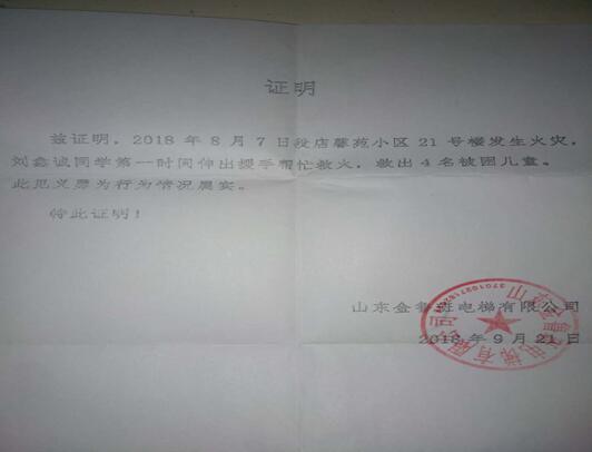 近日,济南槐荫区段店馨苑小区一辅导班发生严重火灾,四名八、九岁的儿童被困于火海中,我校大三实习学生刘鑫诚不顾个人安危,在其他两名住户的协助下,勇闯火海,踹门而入,展开救援,奋力扑救,最终在消防队员赶到后携手成功解救四名儿童和一名辅导老师。为他人生命安全奋不顾身,挺身而出的英勇行为,体现了见义勇为的精神。在外树立了我圣翰学子的形象,也宣传了我圣翰学子的校园文化,这种行为也更加体现了我山东圣翰财贸职业学院的教学育人的宗旨,提出表扬。