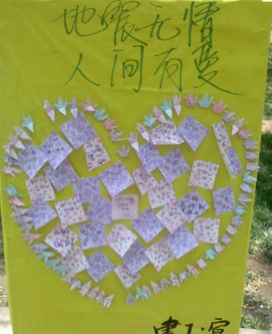 在丁字路口的募捐点摆放着两个展板,展板上用千纸鹤围成了心形图案,中间是同学们对玉树的祈福和祝愿。每一个千纸鹤代表一个愿望,所有的千纸鹤饱含了大家对玉树灾区同胞们的同情和祝愿。另一个展板上贴满了老师们对玉树的祈愿,并积极响应募捐活动,为玉树筹集善款,为玉树灾民献出自己的一份力量。募捐活动持续两天,经过大家不懈的努力和全校师生的支持,最终为玉树灾区筹集到603.4元善款,未来几天内,我院将联系相关单位将捐款悉数汇出。