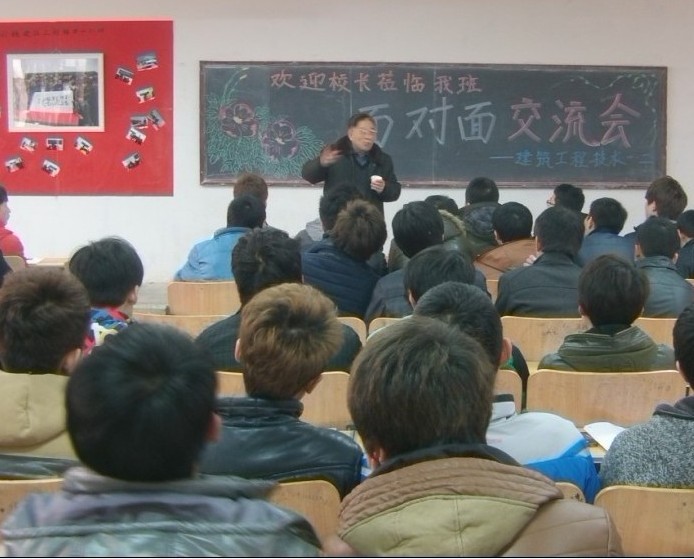 会上,刘校长与学生进行了亲切交流,通过目前在校大学生的几种思想状态为切入点,将大学生生活中常见的问题与学习、就业等方向联系。全班同学纷纷发表了自己的看法,同学们情绪高涨。随后,刘校长根据同学们的提问,一一作了解答,将主题班会的气氛推向了高潮。