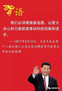 2017年3月12日,习近平在出席十二届全国人大五次会议解放军代表团全体会议时指出:“科技进步深刻改变着人类生产生活方式,也深刻影响着世界军事发展走向。”“我们必须增强紧迫感,以更大决心和力度抓紧推动科技创新和进步。”他强调,“要推动搞好顶层设计和战略筹划,推动国防科技和武器装备军民融合,推动军地合力培育军事人才,推动体制机制和政策制度改革,加快我军建设向质量效能型和科技密集型转变。”