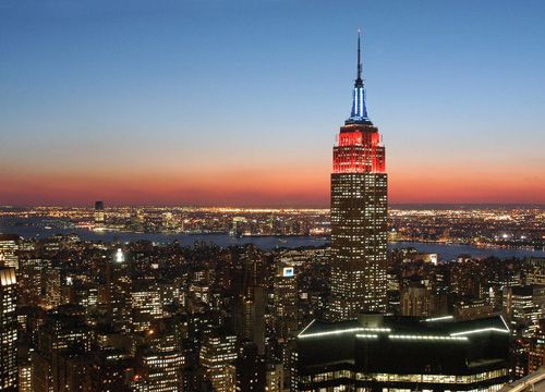 帝国大厦位于曼哈顿第五大道350号,夹在34大街与33大街之间,是纽约市著名的旅游景点之一,它的顶部的泛光灯的颜色会因时间或重大事件而改变,比如说在911事件后就亮了3个月的蓝色灯,以示哀悼。30年代,美国经济处于大萧条时期,人民生活更加困苦,而华尔街的老板们却热衷于修建摩天大楼的竞赛。百万富翁拉斯科布为了显示自己的富有,决意修建一座世界最高的楼房。他找来著名的建筑师威廉·拉姆,问楼房能盖多高?拉姆沉思片刻后回答说:“1050英尺。”拉斯科布对这个高度很不满意,因为这仅仅比当时纽约新建成的克莱斯勒大厦高4英尺。于是,建筑师设法增加了一节200英尺高的圆塔,使帝国大厦的高度为1250英尺。这座摩天大楼只用了410天就建成,也可算是建筑史上的奇迹。
