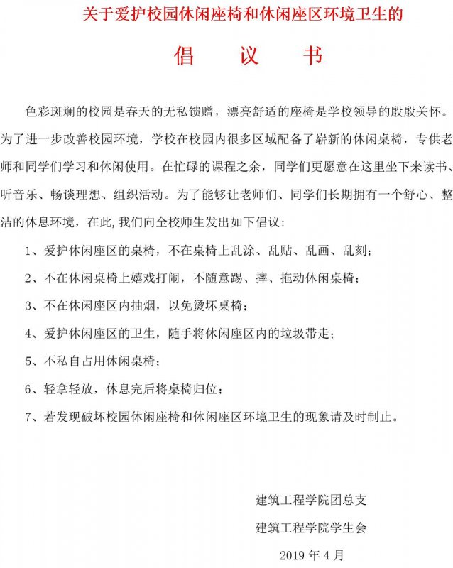 关于爱护校园休闲座椅和休闲座区环境卫生的倡议书