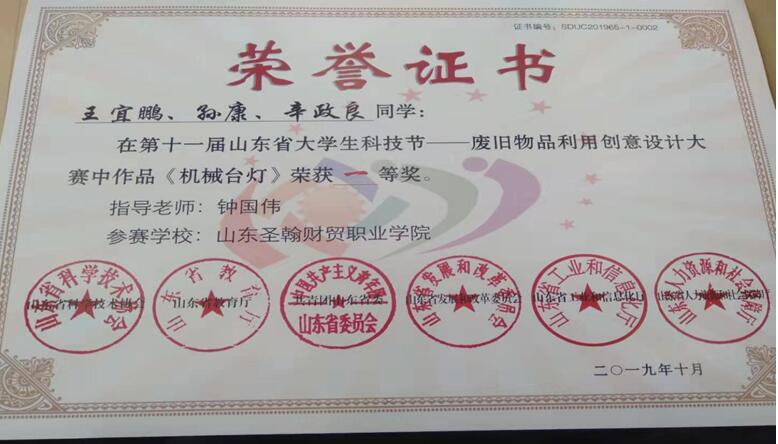 本次大赛历时4个月,共征集到100余件作品,经过层层筛选,最终选出60件作品入围。大赛作品涉及实物、平面设计、视频等,涌现出许多新颖有趣、兼具创新性与技术性的作品;山东圣翰财贸职业学院代表队由智能制造学院钟国伟老师指导的作品“机械台灯”,获得一等奖并现金奖励。