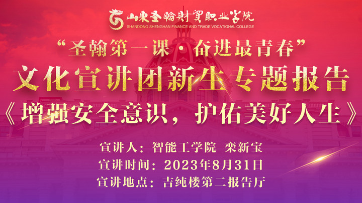 2023年8月31日下午两点,山东圣翰财贸职业学院学校文化宣讲团在吉纯楼第二报告厅开展了新生文化宣讲活动,由智能工学院辅导员栾新宝向智能工学院新生连队作《增强安全意识 护佑美好人生》的专题报告,此次专项报告是为了帮助2023级新生快速融入大学校园生活,更是帮助和引导新生提高安全意识和责任意识,掌握生活必要的防范危险隐患的基本规范和技能,从而更好地为学生提供有温度的服务工作。学院学生管理院长王栋、团总支书记、全体辅导员老师及2023级新生参加本次专题报告。