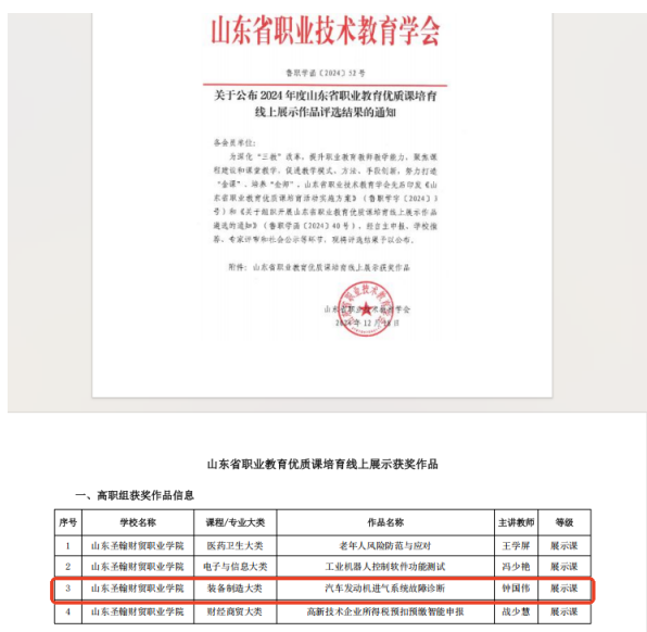 为深化“三教”改革,提升职业教育教师教学能力,聚焦课程建设和课堂教学,促进教学模式、方法、手段创新,努力打造“金课”、培养“金师”,山东省职业技术教育学会先后印发《山东省职业教育优质课培育活动实施方案》和《关于组织开展山东省职业教育优质课培育线上展示作品遴选的通知》等文件,经自主申报、学校推荐、专家评审和社会公示等环节,智能工学院钟国伟老师《汽车发动机进气系统故障诊断》课程荣获展示课。