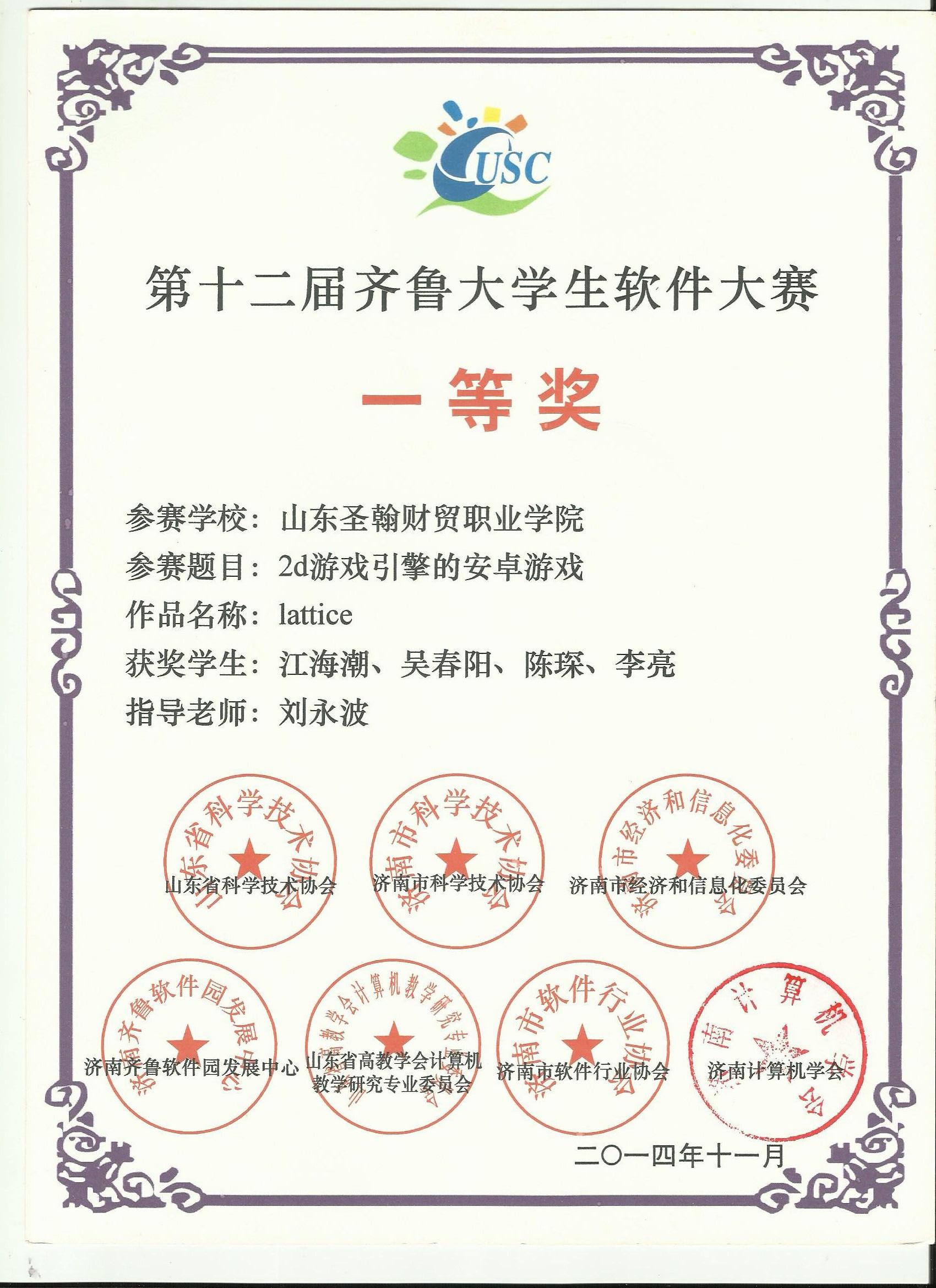 近日,第十二届齐鲁软件大赛及首届济南市计算机科技奖颁奖盛典在山东商业职业技术学院学术报告厅举行。我校信息工程学院The One团队的“2D游戏引擎的的安卓游戏—Lattice”获得一等奖,平凡的坚持团队的“MOOC大型开放式网络课堂”获得作品完成奖。