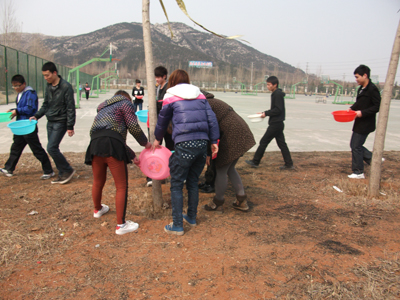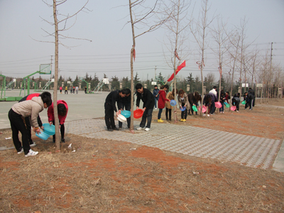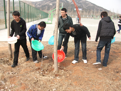 为了把“文明礼貌月活动”和“学雷锋活动”的开展随时落实在具体的行动上,在一年一度的植树节到来之际,信息工程学院组织全体学生会干事对校园内的树木进行浇灌,许多普通同学在学生会干事的感召下也加入了浇树活动。早上,同学们带着自己的水盆准时在规定的地点集合,以小组为单位,男女分工合作,同学们干的热火朝天,一片勤劳的画面。