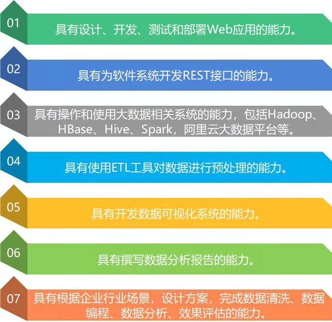 本专业坚持立德树人、德技并修,面向大数据技术与应用等行业企业,培养从事大数据开发、管理和服务等工作,具备良好的职业道德、诚信品质、团队精神和创新素质,掌握大数据平台部署、数据采集、数据加工、数据分析、数据可视化等知识,具备适应社会主义市场经济的能力,德、智、体、美、劳全面发展的高素质技术技能人才。