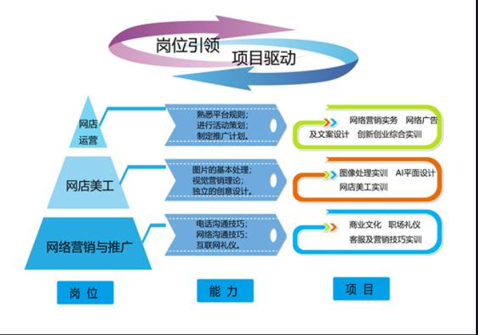 电子商务专业紧跟行业发展,将新模式、新方法纳入教学内容,培养学生的营销推广能力、与客户沟通交流技巧,网店设计美化和维护管理能力,树立创新创业思想,培育和传承工匠精神。