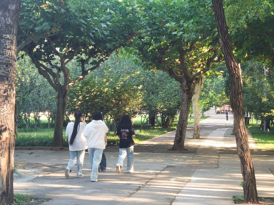 草坪绿意盎然,阳光透过树隙洒落,鸟儿在其间振翅、跳跃,自在飞翔,为校园增添了灵动生机。林荫道间,学生们或三两结伴,或独自前行,迎着朝阳走向教室,青春的身影朝气蓬勃,洋溢着对知识的渴望。