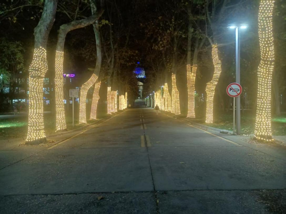 近日,我校在主通行路沿线精心布置了暖黄色小彩灯,以“光影织梦”为主题,营造温馨而富有诗意的夜间氛围。灯光沿着树梢蜿蜒而上,仿佛为冬日的枯枝披上金纱,微风拂过,光点轻轻摇曳,宛如低语着夜晚的温柔。落叶铺就的小径旁,光晕洒落,映照出学子们归途的身影,也照亮了求知路上的每一步。