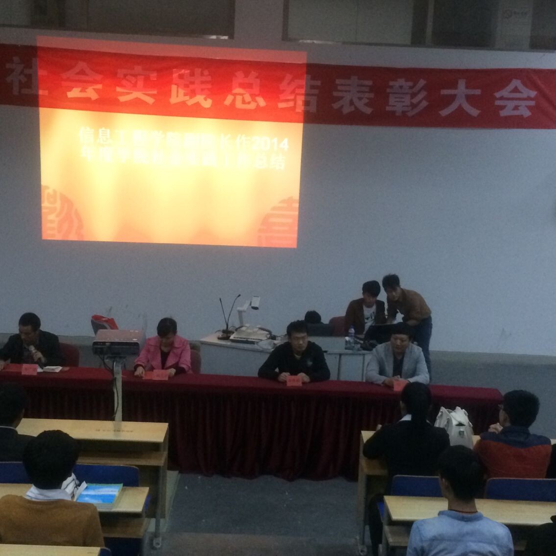 信息工程学院于2014年10月21日16:00在第四报告厅隆重举行了2014年社会实践表彰大会。参加此次会议的有:学生处副处长戴英慧、信息工程学院副院长李桂成、信息工程学院副院长谢广斌、信息工程学院教学秘书孙新、各位辅导员老师以及我院在校全体学生。