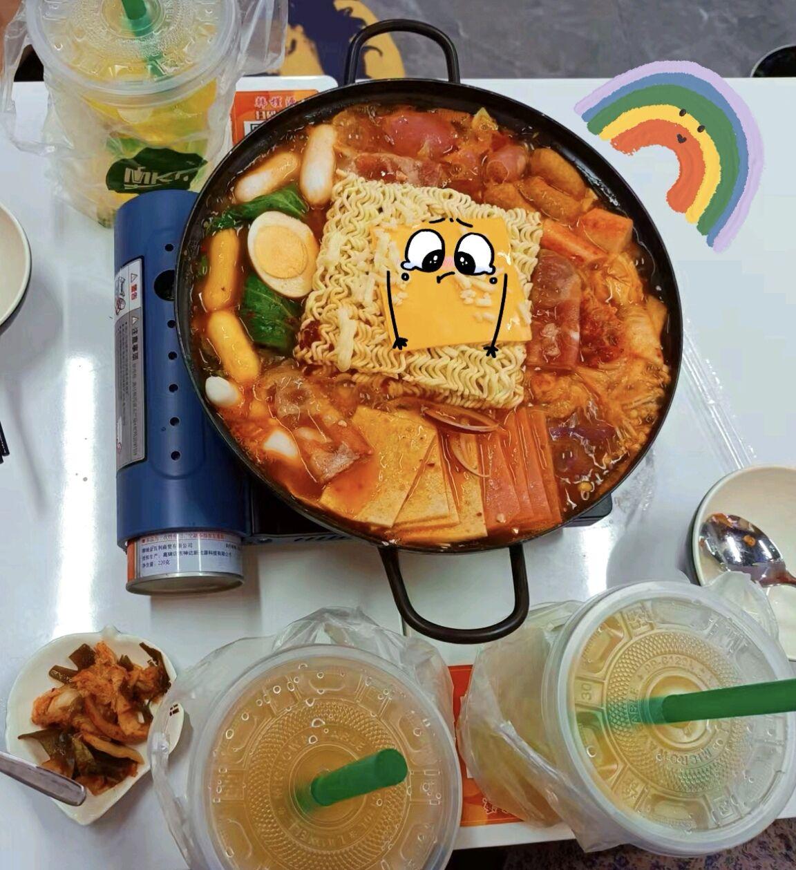 就是现在,又到了一天一度的吃饭时间,脚步停留在韩式料理的门口。毫不犹豫进去点餐,映入我眼练就是那美滋滋的部队火锅。 韩国饮食特点十分鲜明,韩国料理是清淡、少油腻、无味精、营养、品种丰富的料理。部队锅的材料是:方便面、泡菜、年糕、香肠、奶酪、豆腐,蔬菜。再来一片芝士那可以称人间美味。配上果茶和泡茶菜是绝绝子。
