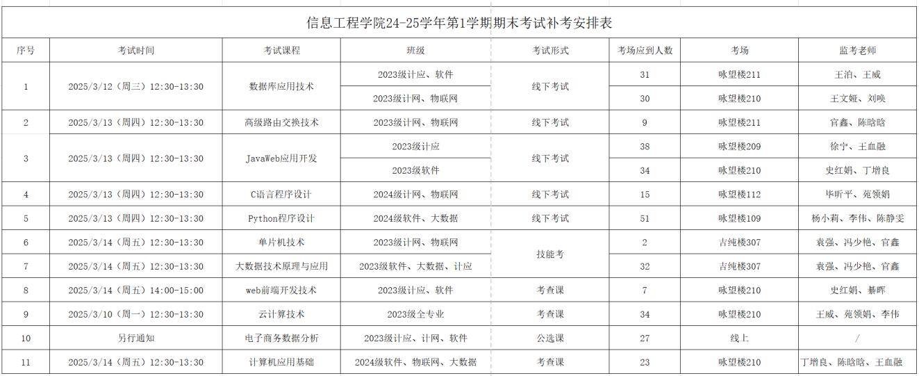 经过精心筹备和有序组织,信息工程学院近日顺利完成了2024-2025学年第一学期的补考工作。此次补考涵盖了5个专业10门课程,共201名学生。