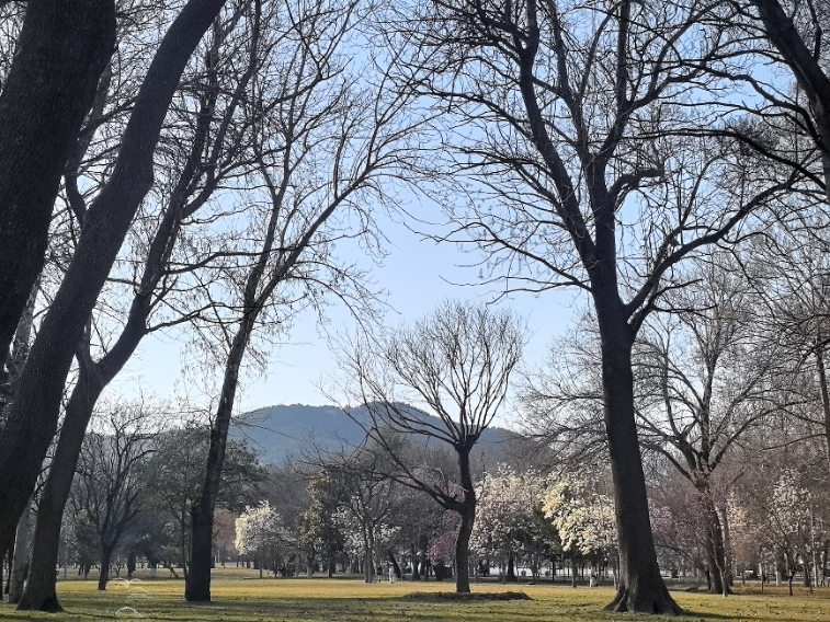 在校园的一角,几棵高大的树木已经展现出春天的气息,树枝上挂满了嫩绿的新叶,与蓝天白云形成了鲜明的对比。远处的山峦在阳光的照耀下显得格外清晰,为校园增添了一份宁静与深远。