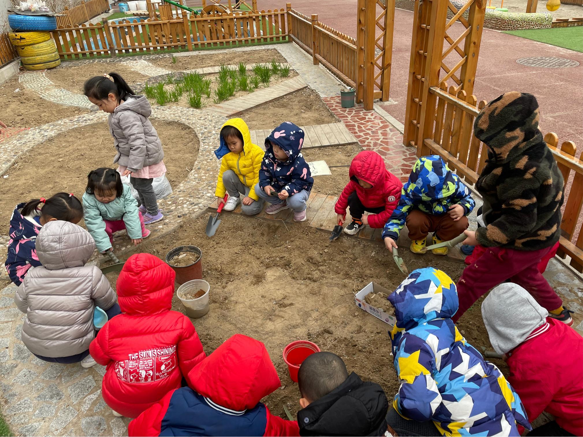 谷雨时节,秧苗初插、作物新种,最需要雨水的滋润,所以人们常说“春雨贵如油”,教师借此机会引导孩子们一起认识种子,种下希望,感受春天里生命的力量。老师们以绘本和观察的方式带领小朋友认识种子以及种植的工具,并让宝贝们自己完成松土、挖坑、播种和浇水。完整的种植过程,使孩子亲近大自然的同时也感受到劳动的快乐。