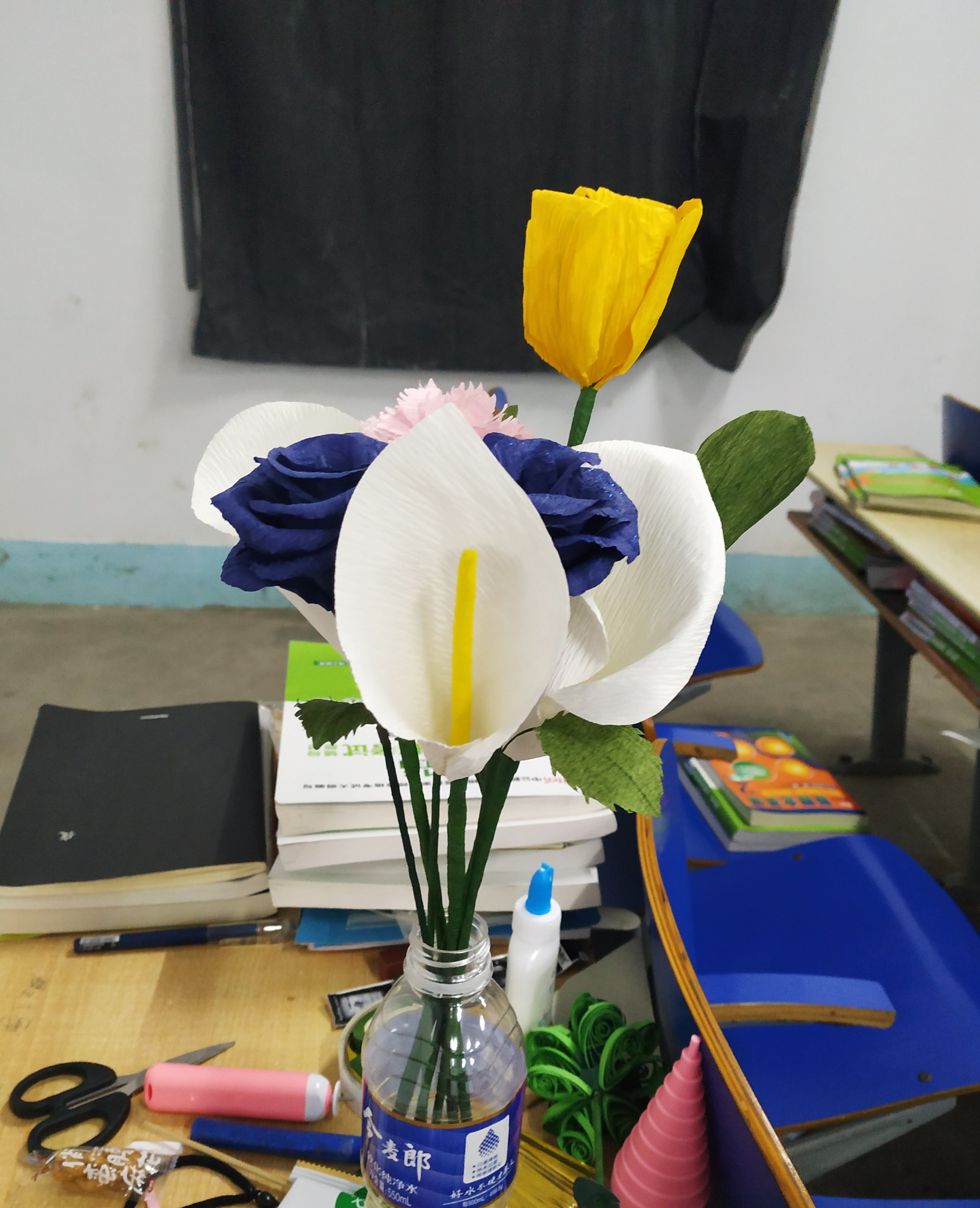 看似简单的马蹄莲但制作起来也是有一定难度的或许与天分有关有的同学虽然也一样认真努力的去完成了但结果不尽人意。但老师告诉我们只要每个人都认真、耐心、努力去完成作品就都是心灵手巧的女孩子!马蹄莲的花语是“诉说沉浸在幸福中的快乐,永结同心、吉祥如意、圣洁虔诚”。所以又是欧洲新娘捧花的最爱!